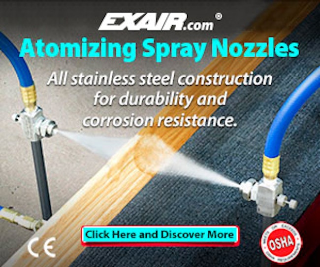 EXAIR’s atomizing spray nozzles atomize fluids in a range of spray patterns for a variety of uses. They combine liquid and compressed air to create a mist of atomized liquid that can be easily adjusted to meet the needs of your application. Good for washing, rinsing, coating, cooling, quenching, wetting and dust control.