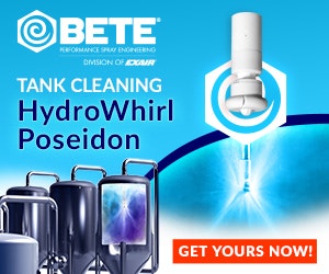 BETE’s HydroWhirl Poseidon offers 360° corrosion-resistant option for tank cleaning. This slow-spinning nozzle provides complete coverage with longer dwell time on target surfaces. Ideal for use in corrosive chemical environments, chemical processing tanks, food and beverage processes, IBC Totes, and more. Crafted from PFTE, the HydroWhirl is 100% corrosion-resistant.
